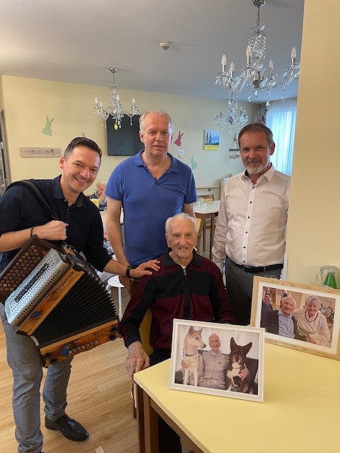 Kürzlich wurde im SeneCura Sozialzentrum Unterpremstätten ein ganz besonderer Geburtstag gefeiert. Bewohner Johann Holzer feierte seinen 102. Geburtstag. Zur großen Überraschung spielte Musikant Christian Gruber mit seiner Harmonika auf. Auch Therapiehund Chester gratulierte dem rüstigen Senior zu seinem Geburtstag. Die herzlichsten Glückwünsche mit Torte und Sekt gab es auch vom SeneCura Team. „Wir wünschen Herrn Holzer alles Liebe und vor allem ganz viel Gesundheit zu seinem Geburtstag.“, so Harald Steiner, Hausleitung des SeneCura Sozialzentrums Unterpremstätten.