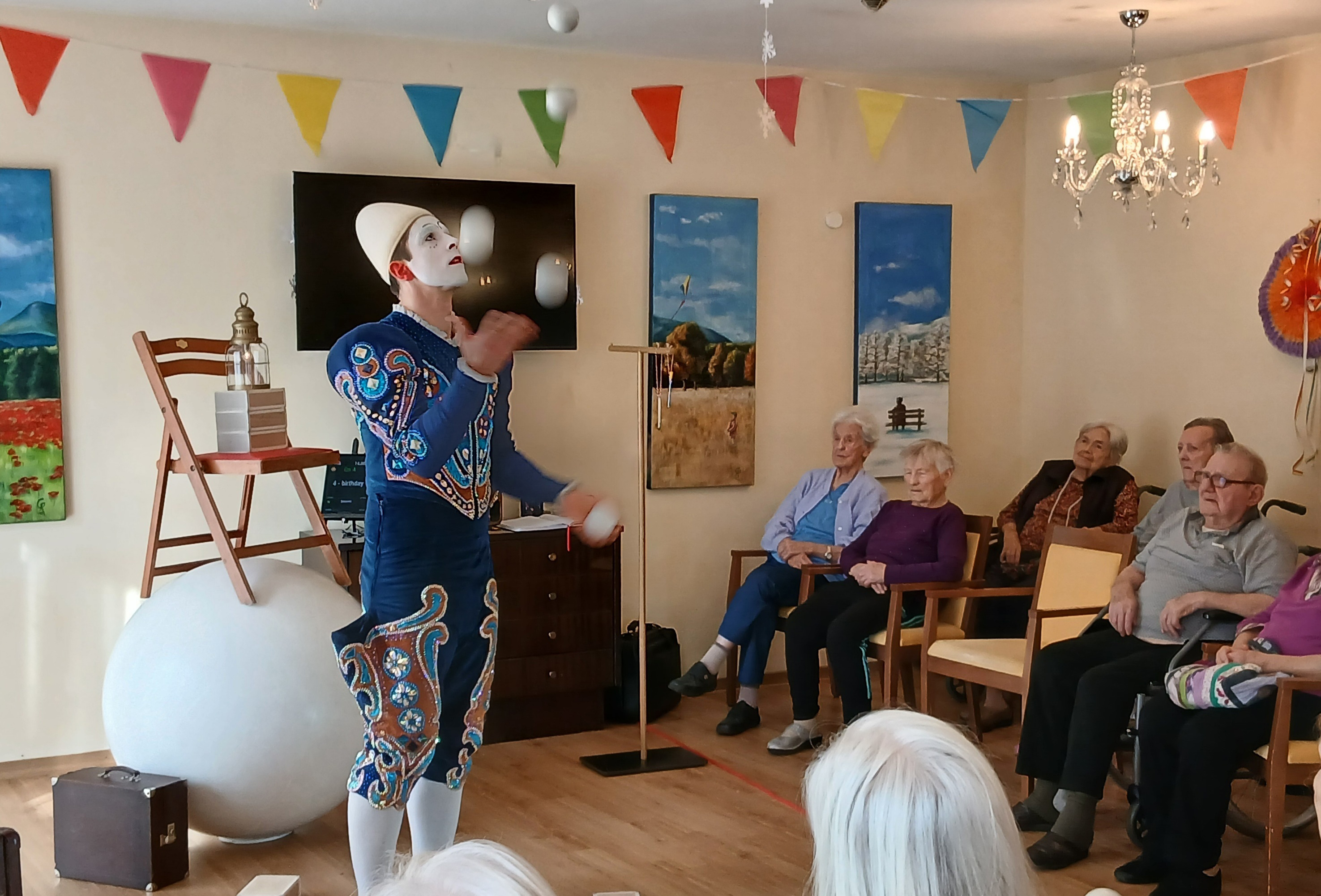 Am 10.02. besuchte Ralph Öllinger mit seiner Performancevorstellung „Pierre Roman und der Wal am Strand“ das SeneCura Sozialzentrum Unterpremstätten. Es handelt sich bei dieser Performance um eine poetische Zirkusvorstellung, die die Bewohner:innen auf eine Reise durch das Leben eines Weißclowns mitnimmt. Hier wird eine bekannte Zirkusfigur mit Leben erfüllt, welche bei den Bewohner:innen einen hohen Wiedererkennungswert besitzt. „Der Weißclown sorgt für Erinnerungen an die Vergangenheit, einen Moment der Entspannung und schlägt eine Brücke ins Hier und Jetzt.“
